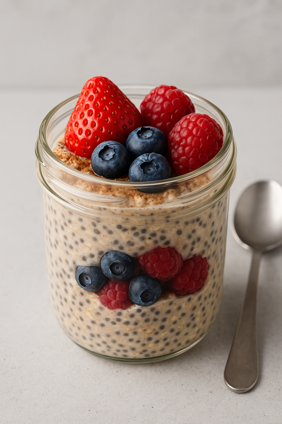 Combine ½ cup rolled oats, 1 tbsp chia seeds, 1 cup unsweetened almond or soy milk, 1 cup mixed berries (blueberries, raspberries, strawberries), and a pinch of cinnamon. Refrigerate overnight.