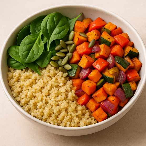 Cook 1 cup quinoa in vegetable broth. Roast a mix of diced sweet potatoes, bell peppers, zucchini, and red onion with olive oil, turmeric, cumin, and black pepper at 400°F for 20–25 minutes. Serve quinoa topped with vegetables, fresh spinach, and a sprinkle of pumpkin seeds.