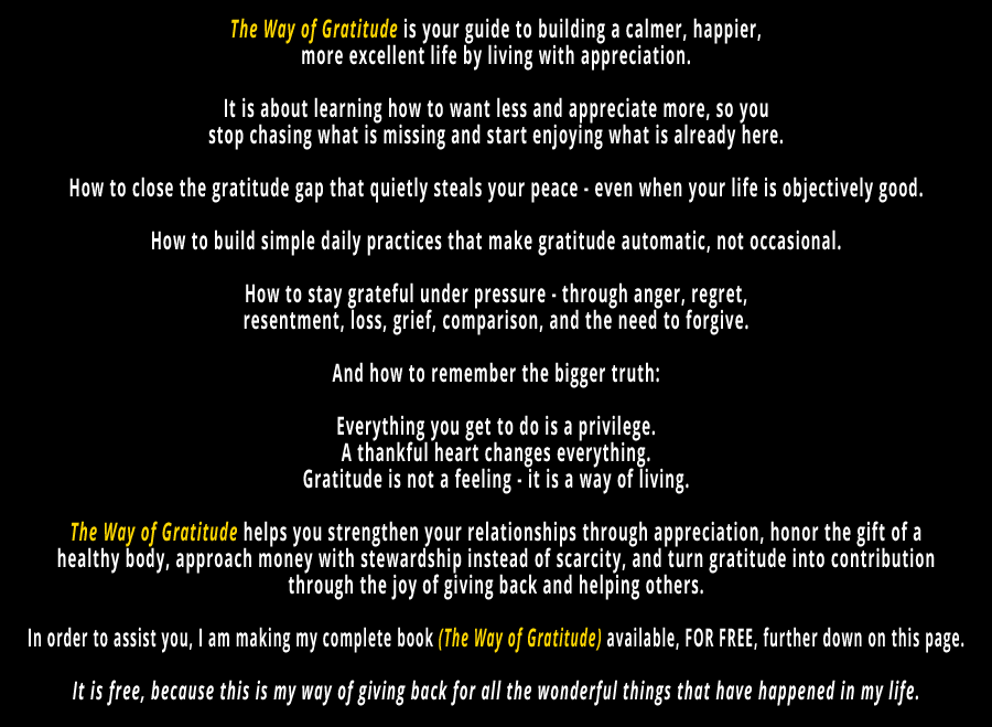 The title of this book is The Way of Gratitude, and the subtitle is Want Less Appreciate More. Those four words are not a slogan. They are a formula.