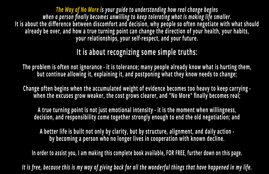 This is also why the larger wisdom of The Way of Excellence (TWOE) matters so much in relation to this book. The Way of Excellence (TWOE) teaches the importance of telling it like it is, taking personal responsibility, embracing change, focusing on the possible, changing perspective, taking consistent action, building integrity, creating balance, and developing willingness, belief, discipline, and commitment. The journey of “No More” is not separate from those truths. It is one of the places where they become especially alive. It is one of the places where a human being finally stops treating those truths as admirable concepts and begins discovering what they look like when lived.