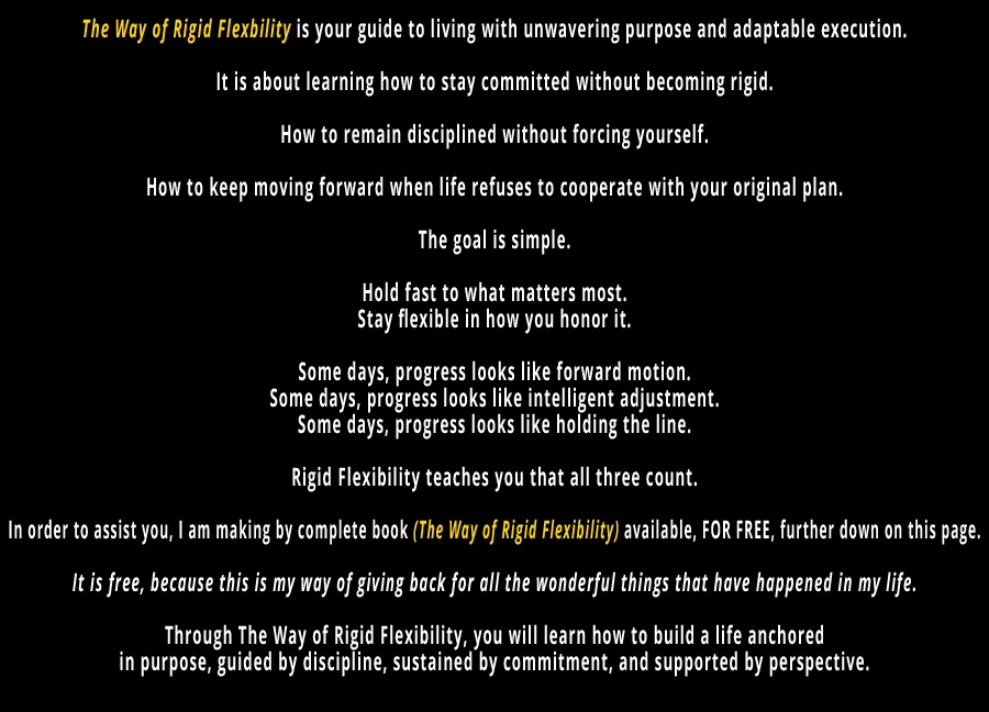 The Way of Rigid Flexibility is the disciplined art of remaining unwavering in purpose yet adaptable in execution. It means building your life around non-negotiable anchors – your core values, daily practices, and long-term goals – while allowing freedom in how you honor them. You hold fast to your commitments but stay fluid in your methods, bending without breaking when circumstances shift. This disciplined art transforms structure into strength, consistency into freedom, and adaptability into mastery. In essence, The Way of Rigid Flexibility is the practice of living with conviction and grace – pursuing excellence without rigidity and progress without perfection.