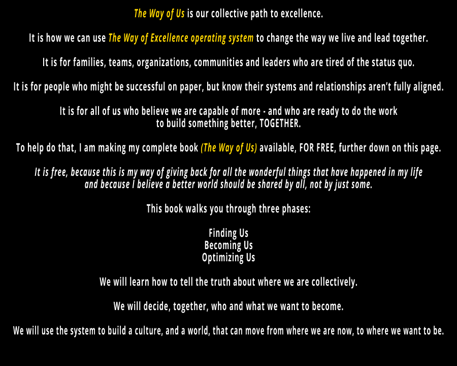 That is what this book is about. The Way of Us is my attempt to answer a simple but urgent question: What happens when we apply The Way of Excellence not just to “me,” but to “we.”